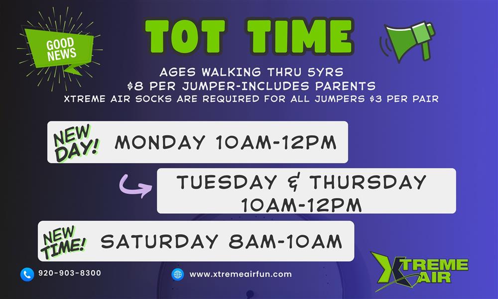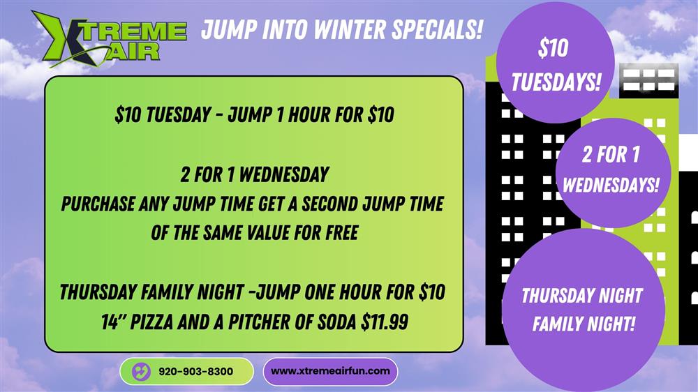 WINTER HOURSMONDAY-TUESDAY-THURSDAY TOT TIME 10am-12pm OPEN JUMP 12pm-7pm WEDNESDAY OPEN JUMP 12pm-7pm FRIDAY 12pm-8pm SATURDAY TOT TIME 8am-10am OPEN JUMP 10am-8pm SUNDAY 11am-6pm CLOSING TIMES MAY VARY BASED ON BUSINESS VOLUME, STAFFING, & PRE-PURCHASED TICKETS. JUMP TIMES CANNOT BE SOLD AFTER 1 HOUR PRIOR TO CLOSING. PLEASE CHECK OUR WEBISTE OR FACEBOOK FOR ANY UPDATED HOURS!Special Hours and Events can be found under the Calendar Tab as they become available.ROCK WALL & WIPEOUT are not always availableThere may be times when Rock Climbing & Wipe Out are not available due to staffing & business volume. Trampoline Floor & Ninja Course are always open.