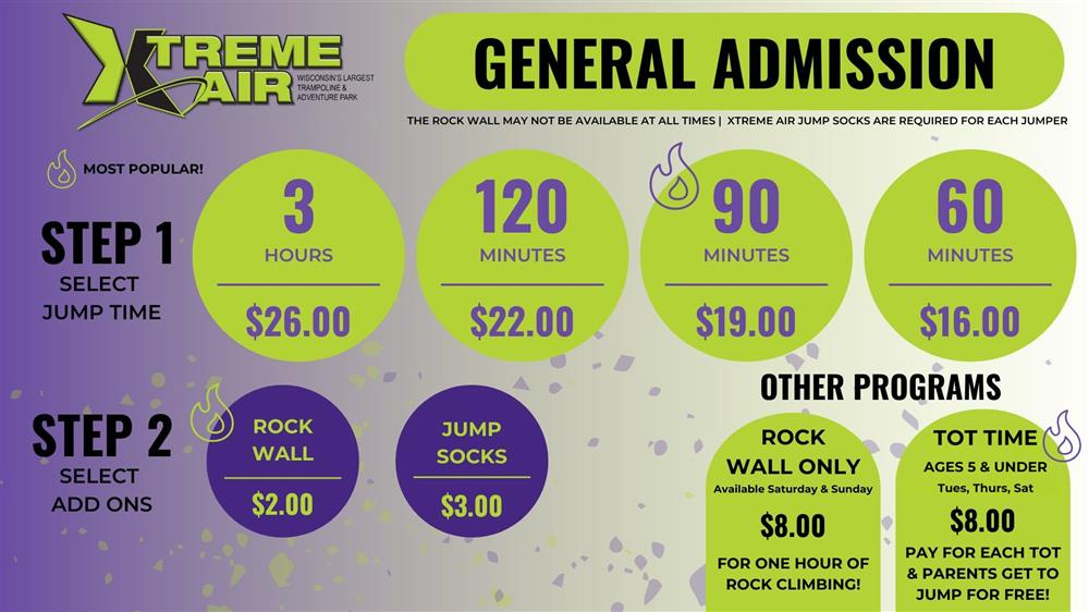 PRICE PER PERSON60 minutes- $16.0090 minutes- $19.00120 minutes- $22.003 Hours- $26.00ADD ONS: Rock Wall $2.00 (unlimited during jump time)*All jumpers must wear a pair of Xtreme Air Grip & Go Socks: $3.00/pair (socks from other trampoline parks cannot be worn)MUST BE 3 YRS OR OLDER TO JUMP DURING OPEN JUMP TIME |
